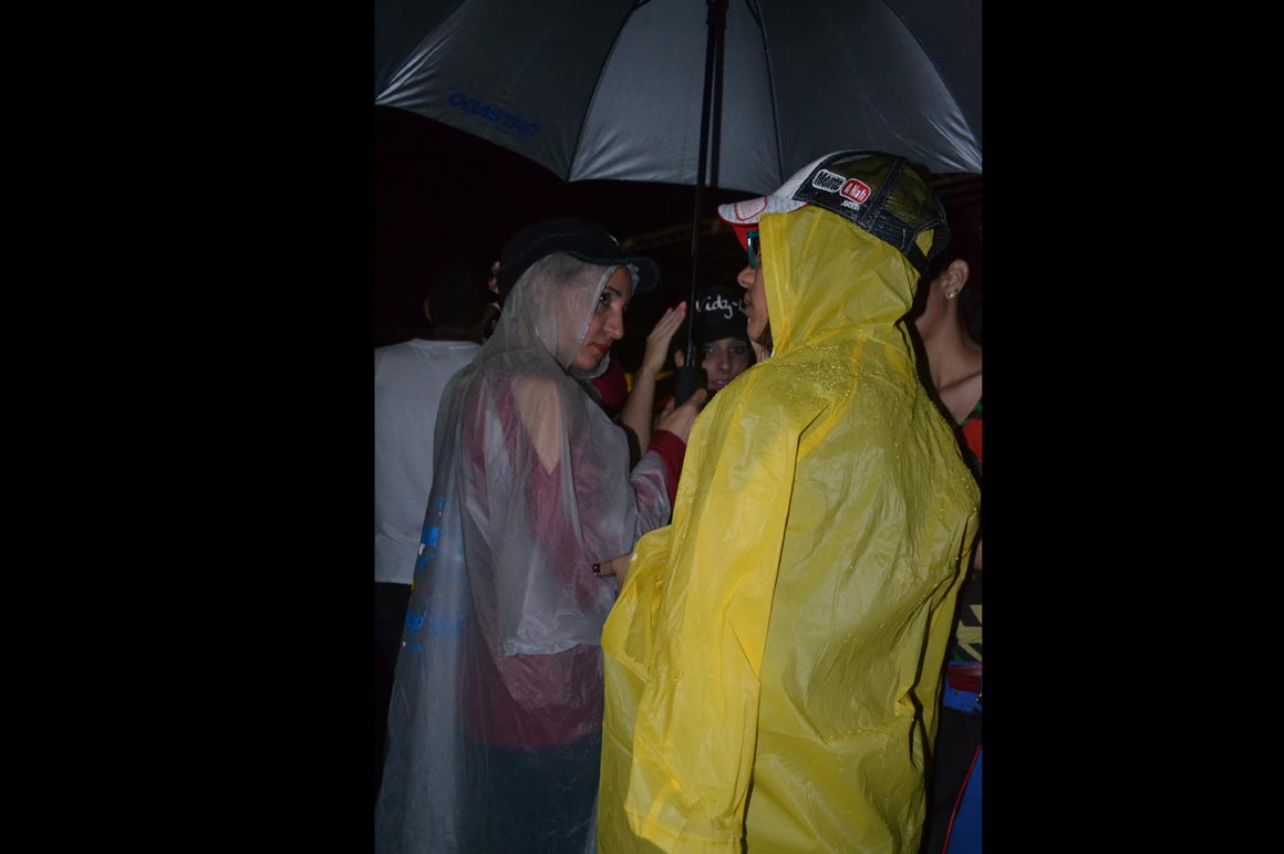 Cartones, sombrillas, chalecos impermeables, abrigos, compañeros o compañeras, debajo de sus acompañantes, se guarecían de las lluvias, las lluvias no dañaron la fiesta, no detuvo el entusiasmo, que una vez empezado el espectáculo se extendió por más de dos horas.