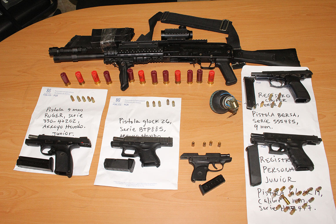 A los detenidos se les despojó de cinco pistolas, una escopeta automática con mira telescópica, una flotilla de siete vehículos, ropa militar, chalecos antibalas, balanzas para pesar sustancias controladas y más de 25 equipos de telefonía móvil.