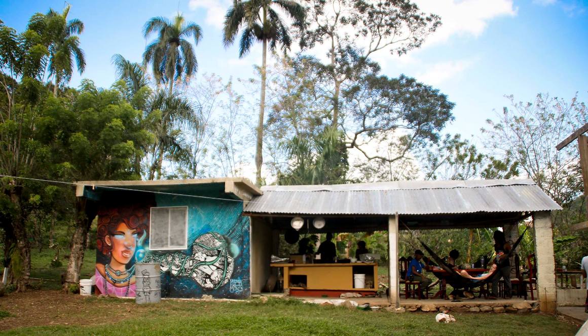 Tras pasar las puertas de la aldea ecológica, se aprecian murales que visten la casa verde con dibujos, formas y símbolos que expresan la ecología y la cultura taína. Algunos segundos de observación bastan para captar su finalidad de ofrecer un espacio pro diverso a los amantes de la naturaleza, del arte y la cultura.