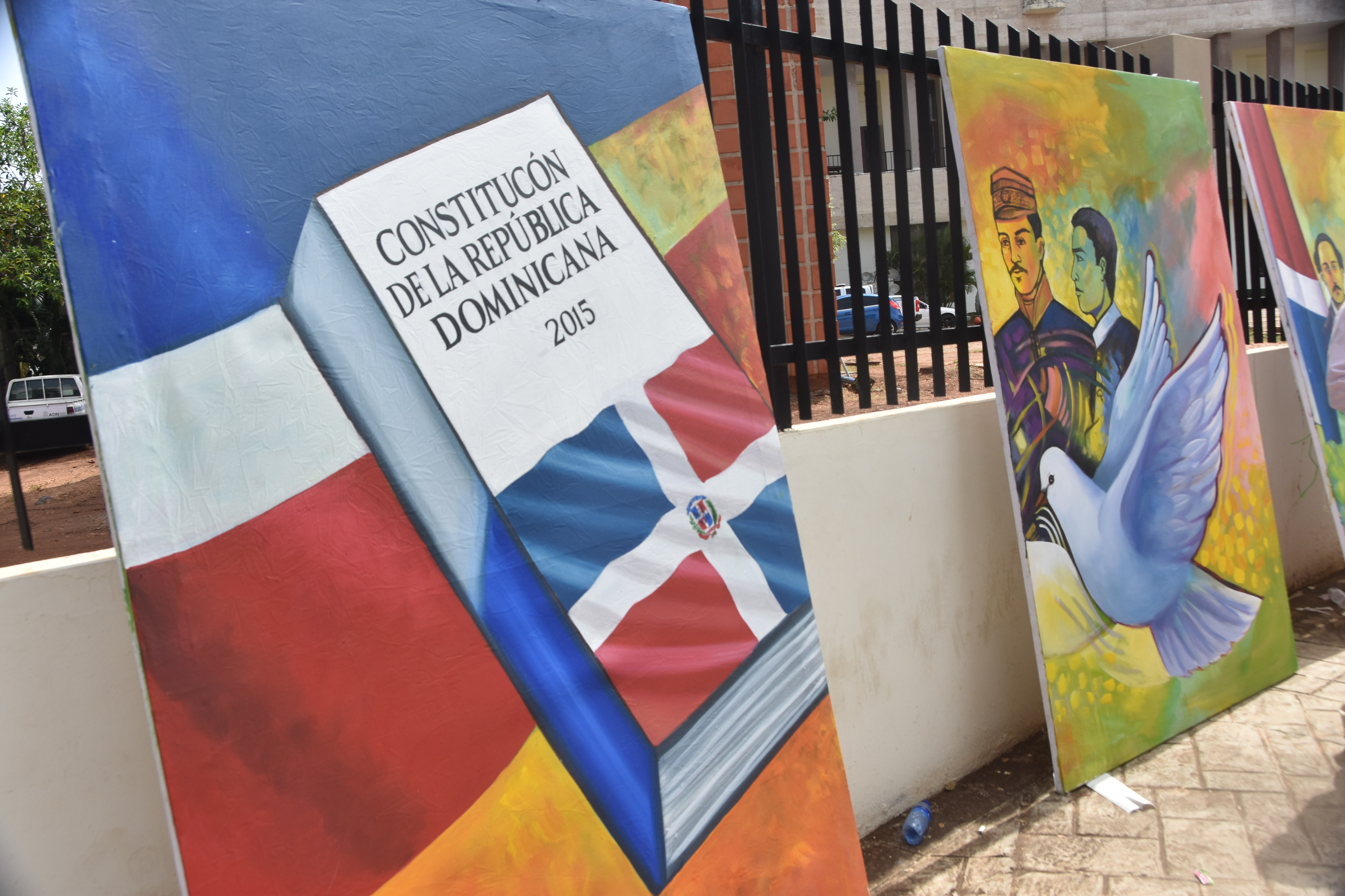 Artistas plásticos que durante el día martes tuvieron altercados para acceder a las inmediaciones del Congreso Nacional para pintar murales allí, colocaron sus obras artísticas detrás de las siete mesas dispuestas para la firma del libro en contra de la reforma constitucional.