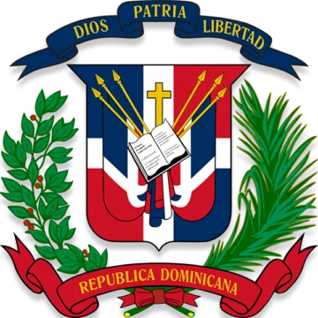 Lleva en el centro el libro de los Evangelios, abierto (en San Juan 8:31-32), con una cruz encima, surgiendo de un trofeo de dos lanzas y cuatro banderas nacionales sin escudos. Está flanqueado por un ramo de laurel del lado izquierdo y una palma del derecho, coronado por una cinta azul ultramar con el lema: DIOS, PATRIA Y LIBERTAD, y en la base una cinta rojo bermellón que reza: REPÚBLICA DOMINICANA. Este emblema tiene una ubicación exclusiva: va en el centro de la bandera, en la banda presidencial, en los kepis militares y policiales, y en documentos oficiales.