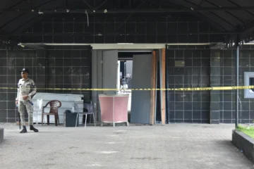 Algunos encienden velas, otros se toman selfis en silencio, mirando los muros agrietados y vallas amarillas donde cuelgan aún las fotografías de decenas de víctimas.