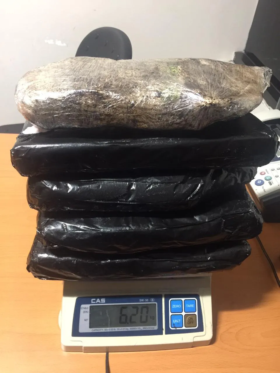 En ese momento y en presencia de un fiscal adjunto se procedió a requisar en el equipaje, ocupando en su interior un bulto de color negro con cinco paquetes presumiblemente cocaína o heroína, con un peso preliminar de 6.20 kilogramos.