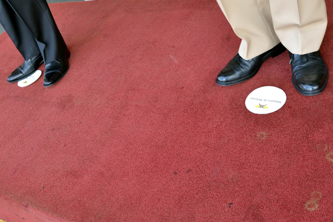 El traspaso de manto tuvo lugar en la explanada frontal de la sede del Ministerio de Defensa, donde el ministro saliente, Sigfrido Pared Pérez, entregó el bastón de mando al teniente general Muñoz Delgado, nuevo jefe de los cuerpos armados.