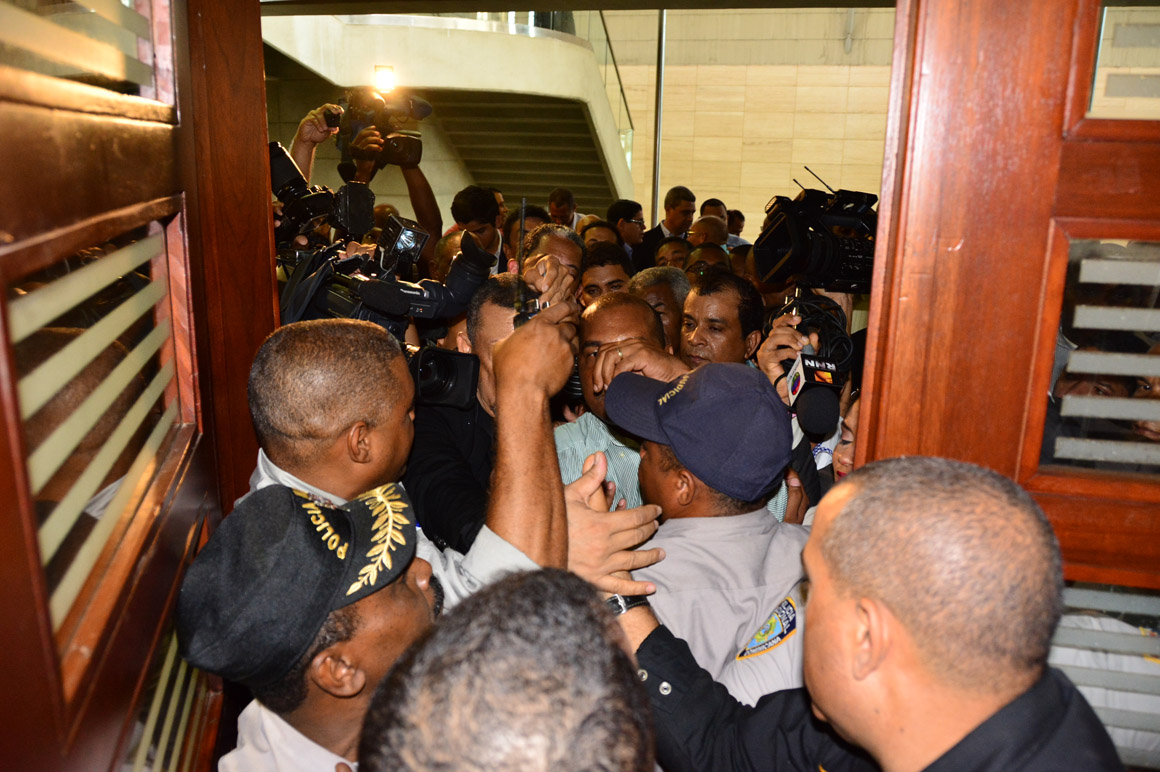 Tras golpes y empujones, la prensa pudo penetrar al lugar donde minutos más tarde de iniciada la audiencia, 10 de la mañana, ocurrió un apagón que solo afectó la sala dejando en la oscuridad los allí presente.