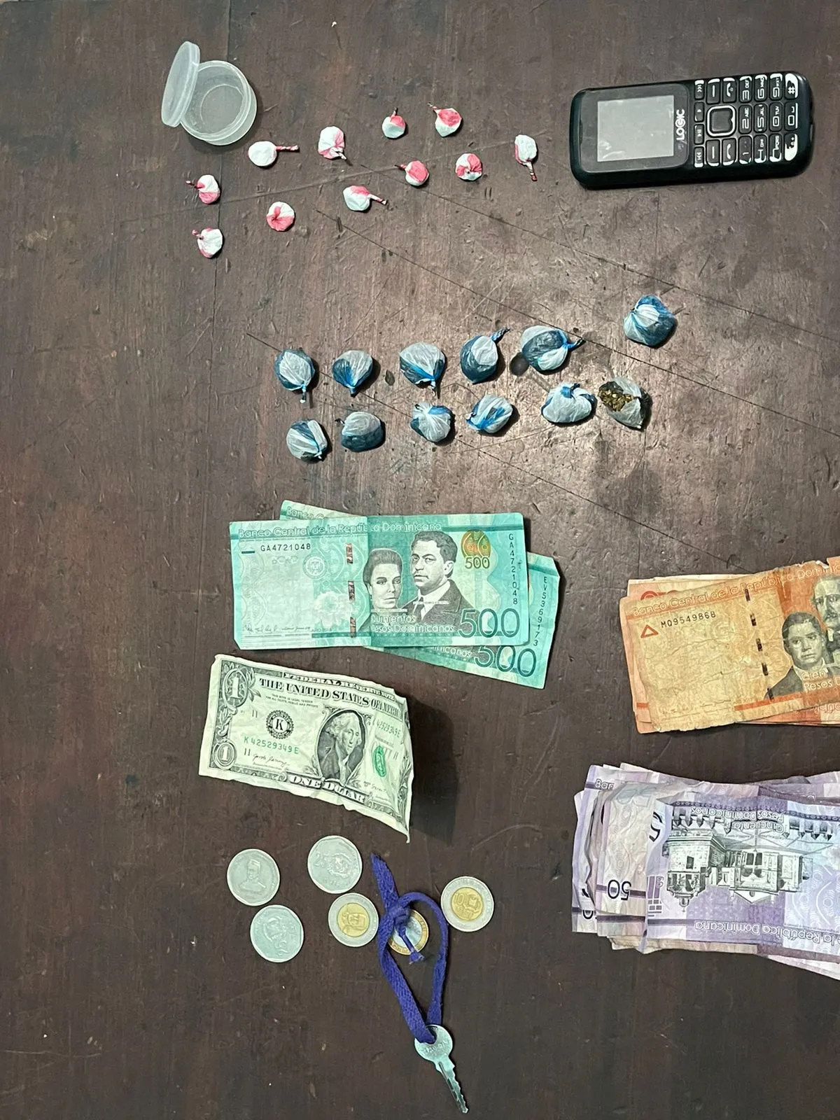 Del total de drogas decomisadas están 12 porciones de un polvo blanco presumiblemente cocaína, una de un vegetal, presumiblemente marihuana, y otra de un material rocoso que se presume es crack.