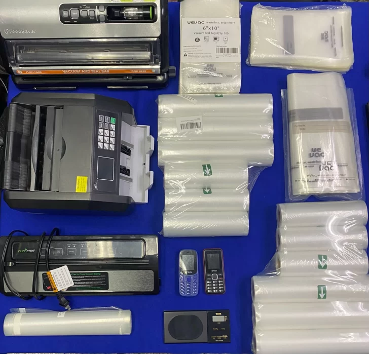 En el allanamiento se confiscó además dos pistolas, tres cargadores, una escopeta, varias cápsulas, una balanza, dos celulares, dos máquinas de sellado al vacío, una máquina de contar dinero, US$ 25 mil 186 dólares estadounidenses, un autobús tipo van, varios rollos y fundas plásticas, entre otras evidencias.