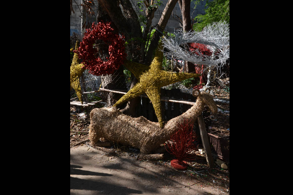 Un manjar de colores se luce en el taller de Oscar, arboles blancos, verdes, azules; estrellas pequeñas y grandes; enormes burritos y bolas en distintos tonos que cubren todo el espacio de tierra rodeado de una gran verja de alambre.