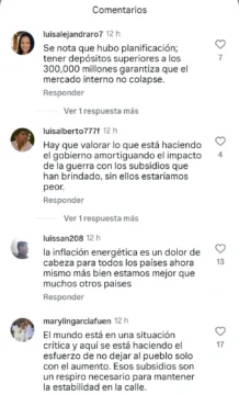 Otros comentarios coincidieron en que la inflación energética es un fenómeno global, indicando que la situación local se mantiene más controlada en comparación con otros países. En ese sentido, varios internautas consideraron que los subsidios representan un alivio necesario para preservar la estabilidad económica y social.