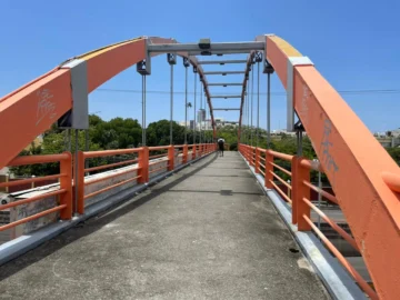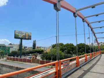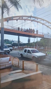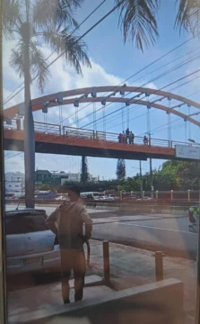 Miembros de la Policía Nacional y la Defensa Civil aseguraron hoy martes a un hombre que se encontraba colgado del puente peatonal sobre la avenida 27 de Febrero, próximo a la Núñez de Cáceres, en Santo Domingo.