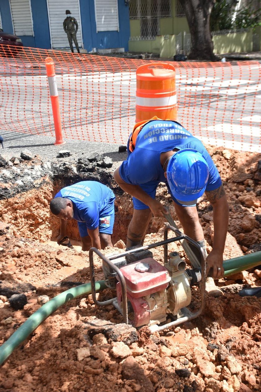 El funcionario añadió que “nuestras brigadas se emplearon a fondo este fin de semana hasta corregir a la mayor brevedad una fuga en una línea de 16 pulgadas, en la avenida Doctor Delgado esquina César Nicolás Penson, próximo al Palacio Nacional, mientras que a las viviendas que resultaron afectadas de manera parcial por la intervención les fue restablecido el suministro de agua”.