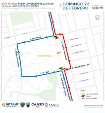 Además, el Instituto Nacional de Tránsito y Transporte Terrestre (Intrant) informó que este domingo 22 de febrero de 2026, a partir de las 12:00 del mediodía, se realizará una intervención en un tramo de la avenida José Núñez de Cáceres, comprendido entre las calles Olof Palme y Celeste Woss y Gil.