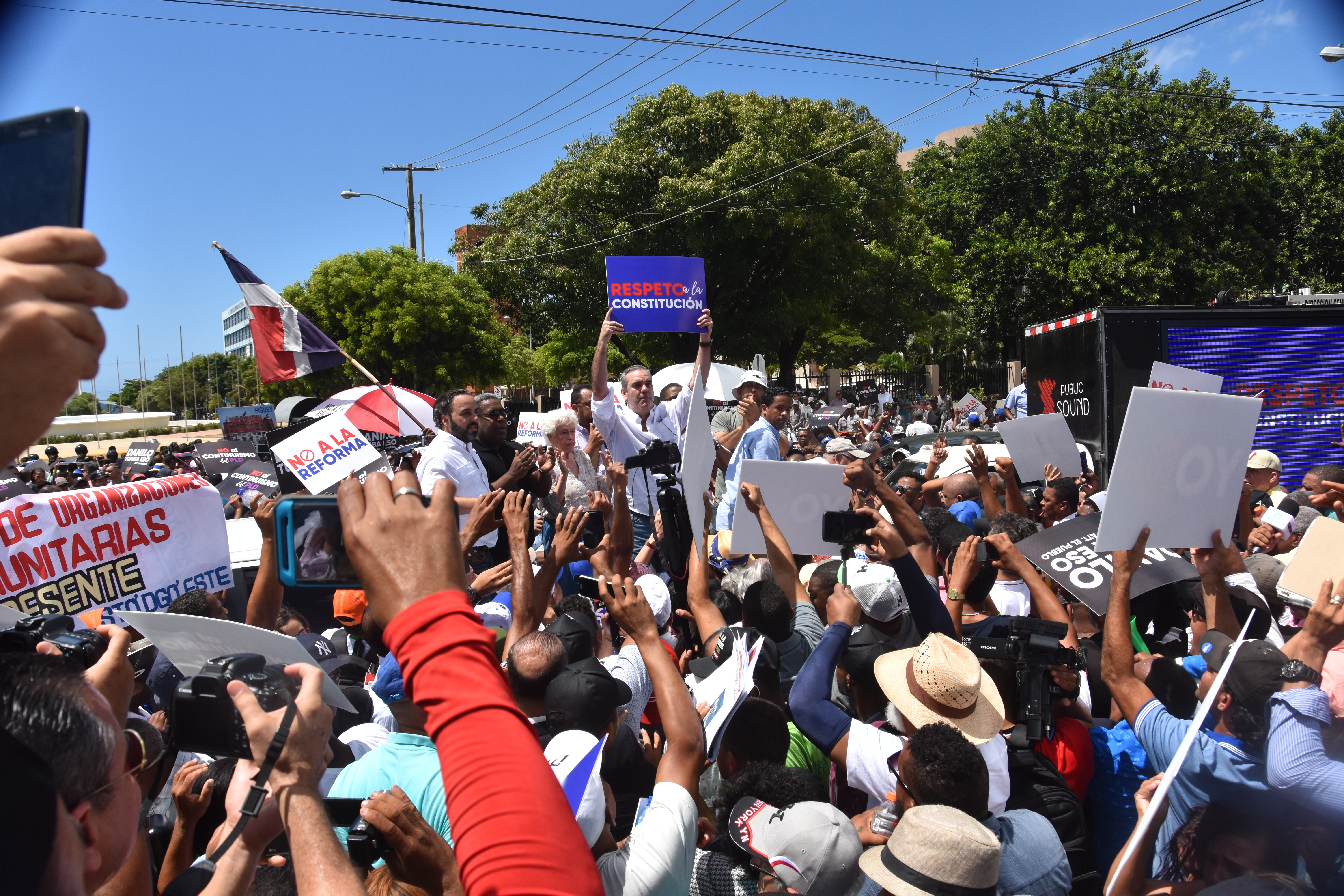 Las personas convocadas por el PRM para protestar en contra de la reforma constitucional bajo el fin de favorecer la reelección del actual mandatario Danilo Medina, llegaron a las 11:00 de la mañana con trompetas, tambores y carteles reclamaban desde el respeto a la Constitución hasta la renuncia de Medina.
