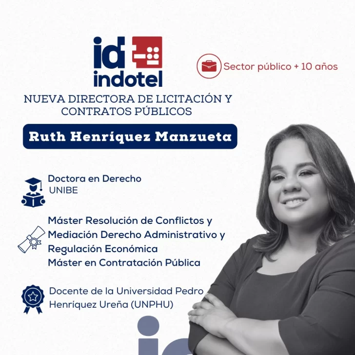 La nueva directora de Licitación y Contrataciones Públicas será la doctora en Derecho, Ruth Henríquez Manzueta, docente en la Universidad Pedro Henríquez Ureña (UNPHU). Posee un máster en Resolución de Conflictos y Mediación Derecho Administrativo y regulación Económica, así como un máster en Contratación Pública.