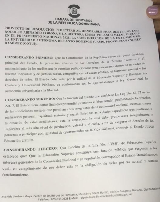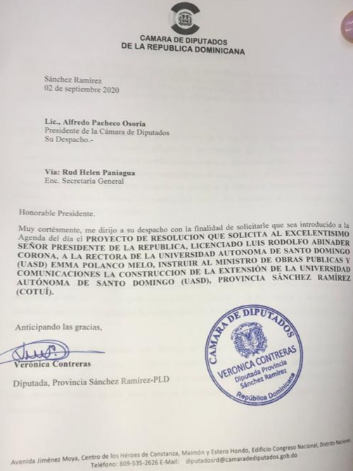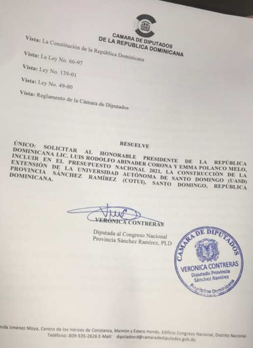 SÁNCHEZ RAMÍREZ, República Dominicana.- La diputada Verónica Contreras, solicitó al presidente Luís Abinader, incluir en el presupuesto del 2021 la construcción de la extensión de la Universidad Autónoma de Santo Domingo (UASD) para la provincia Sánchez Ramírez, mediante proyecto de resolución sometido en la Cámara de Diputados.