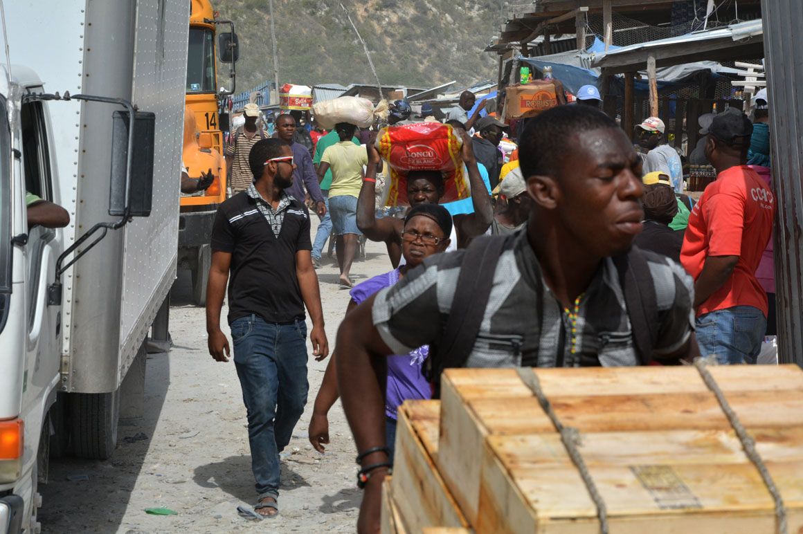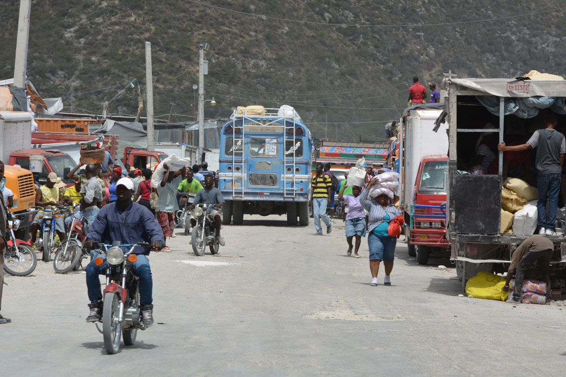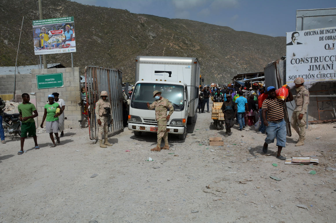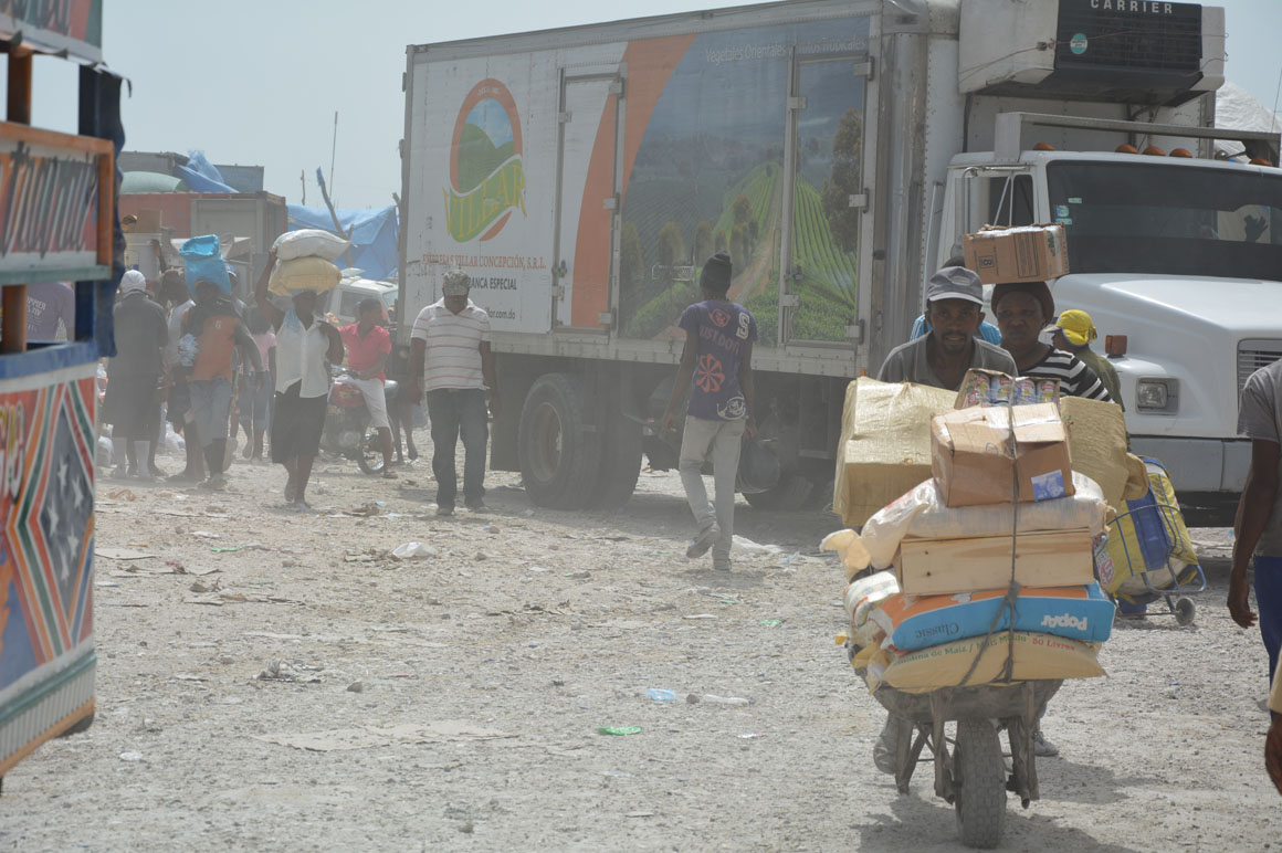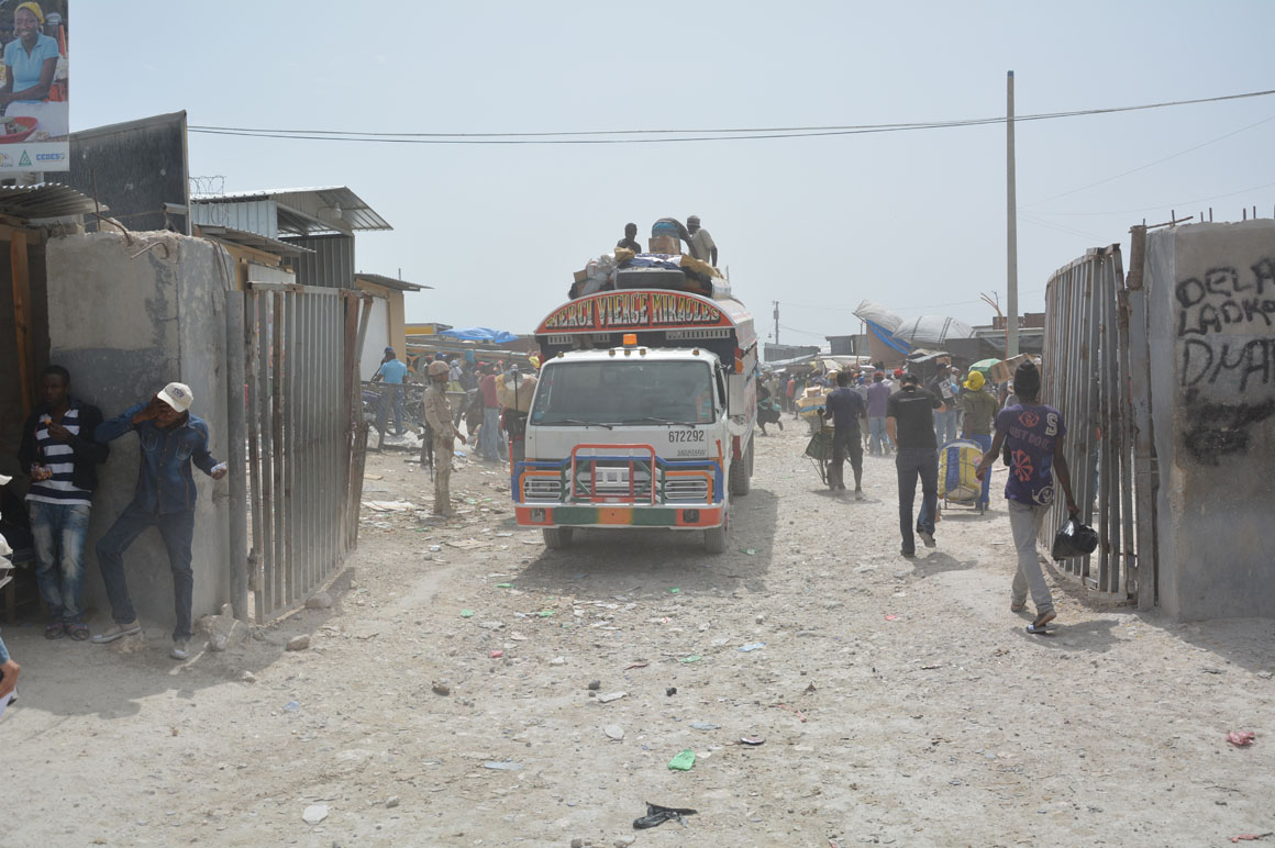 Algunas mujeres se cubren los rostros y otras el pelo, previniendo la polvareda que levantan los vehículos al transitar, sobre todo los camiones,por la angosta vía. Al llegar al punto de inspección antes de entrar a territorio haitiano a cada conductor le espera una larga fila.