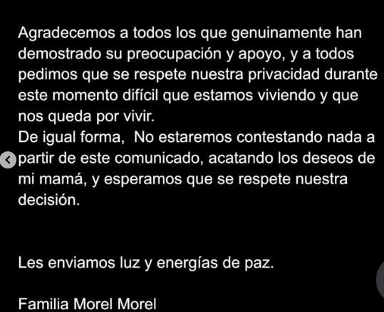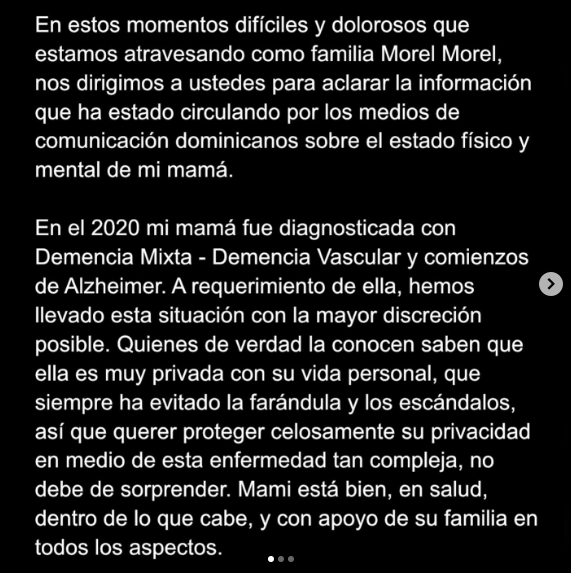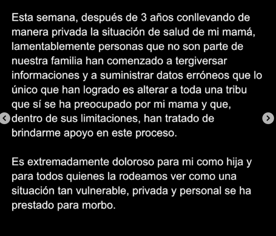 "Esta semana, después de tres años conllevando de manera privada la situación de salud de mi mamá, lamentablemente personas que no son parte de nuestra familia han comenzado a tergiversar informaciones y a suministrar datos erróneos que lo único que han logrado es alterar a toda una tribu que sí se ha preocupado por mi mamá y que dentro de sus limitaciones han tratado de brindarme apoyo en este proceso", precisó su hija en el comunicado publicado a través de Instagram.