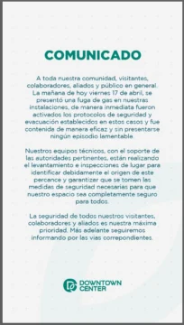 El centro comercial Downtown Center informó que la mañana de este viernes 17 de abril se registró una fuga de gas en sus instalaciones, la cual fue atendida de inmediato mediante la activación de los protocolos de seguridad y evacuación.