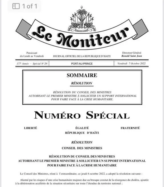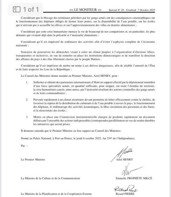 Según publica este viernes el Diario Oficial de la República de Haití, Le Moniteur, el Consejo de Ministros autoriza al primer ministro, Ariel Henry, a "solicitar y obtener" de los socios internacionales "apoyo efectivo para el despliegue inmediato de una fuerza armada especializada, en cantidad suficiente, para poner fin en todo el territorio a la crisis humanitaria".