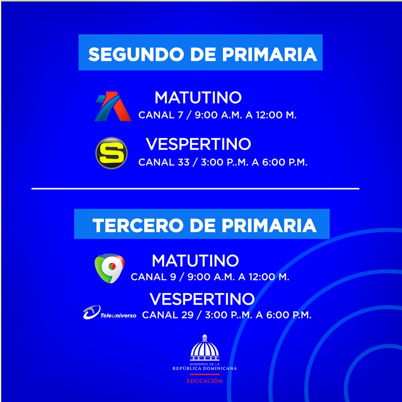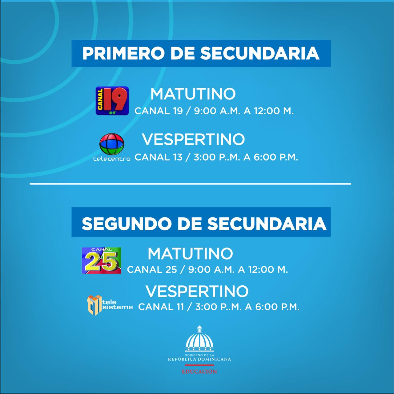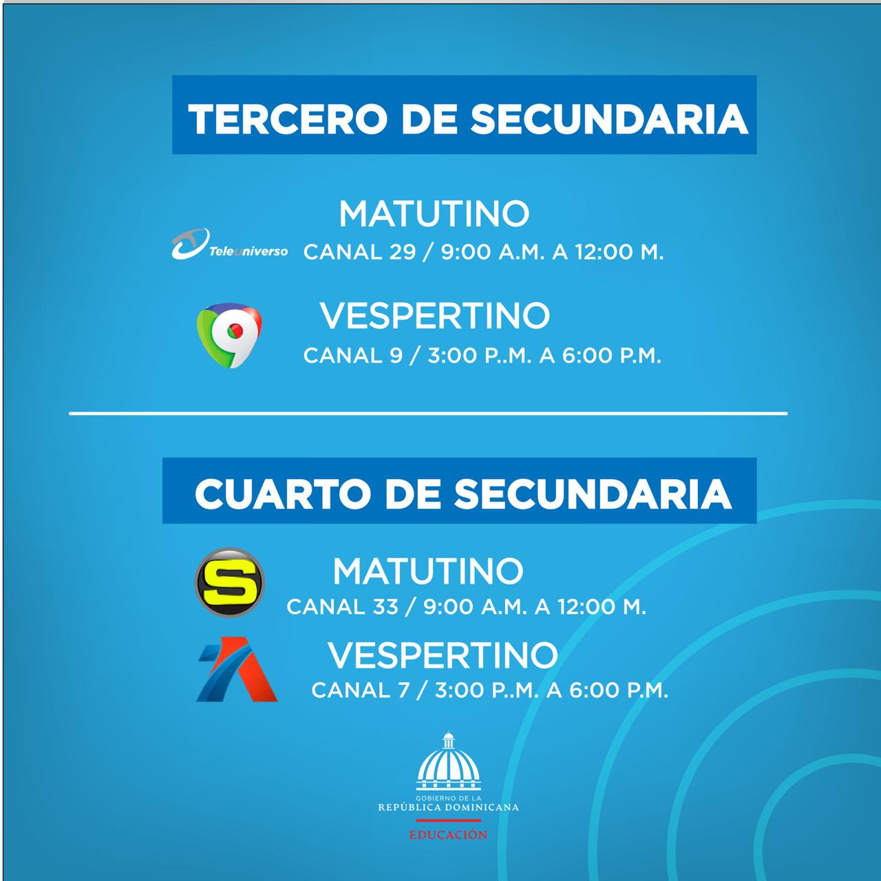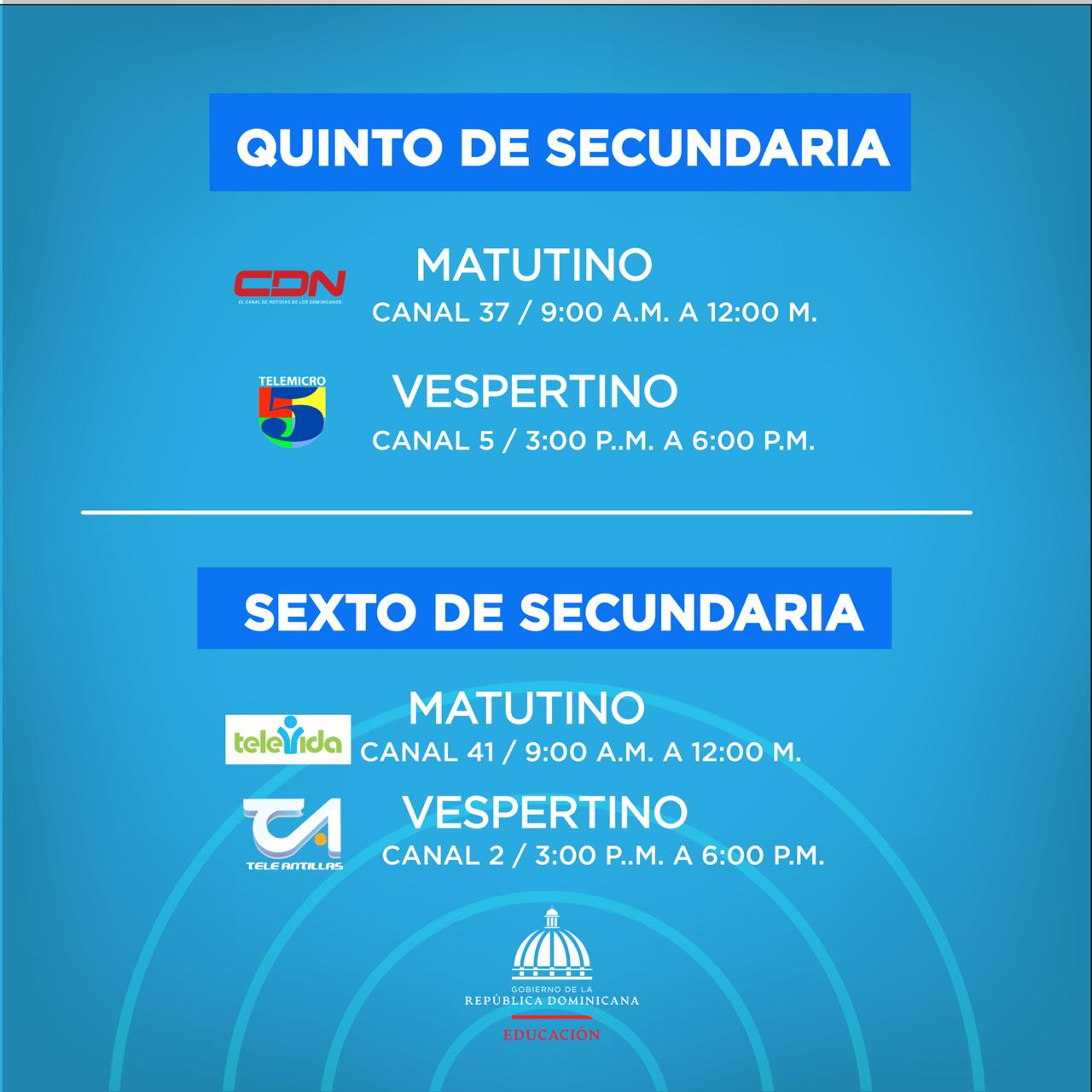 El Ministerio de Educación ha dispuesto que los lunes y los miércoles se transmitirán las clases de Español, los martes y los jueves Matemáticas, los viernes se alternará un plan de reforzamiento de las materias de las cuatro áreas que son objeto de Pruebas Nacionales: Lengua Española, Matemática, Ciencias Naturales y Ciencias Sociales.
