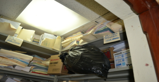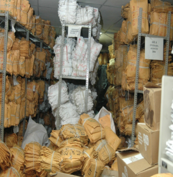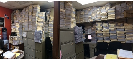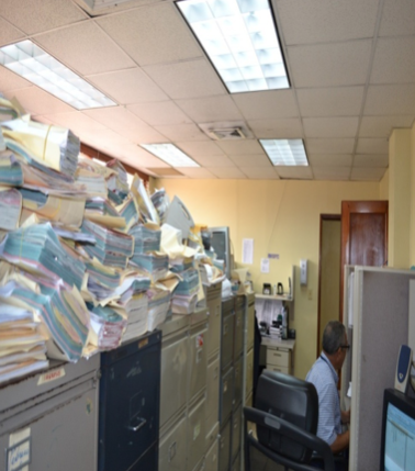 4.16 Se cuestiona la construcción de una bóveda. Vea a continuación las fotos de la situación archivística y las condiciones deplorables en que se producía el almacenamiento de documentos y la convivencia del personal en situación penosa con el cúmulo de los mismos amontonados, en violación de la Ley del Archivo General de la Nación No. 481-08. Veamos:
