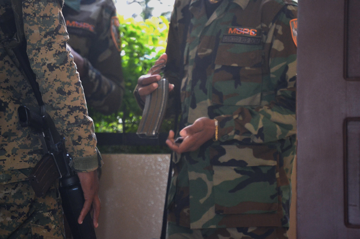 El soldado con cara de asombro y preocupado por el evento no pudo recargar el arma, guardó las cargas y el dispositivo en sus bolsillos, mientras simulaba tener en su mano un fusil apto para disparar.