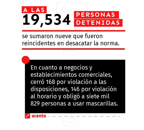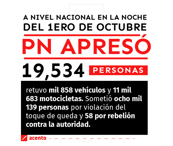 En violación al toque de queda, el primer día de octubre la Policía Nacional (PN) apresó tres mil 549 personas, retuvo 349 vehículos y mil 581 motocicletas. Sometió dos mil 052 personas y otras siete por rebelión a la autoridad. Las estadísticas que lleva la institución indican que esa noche cerró un negocio por violación al horario y tuvo que obligar a 104 personas a usar mascarilla.