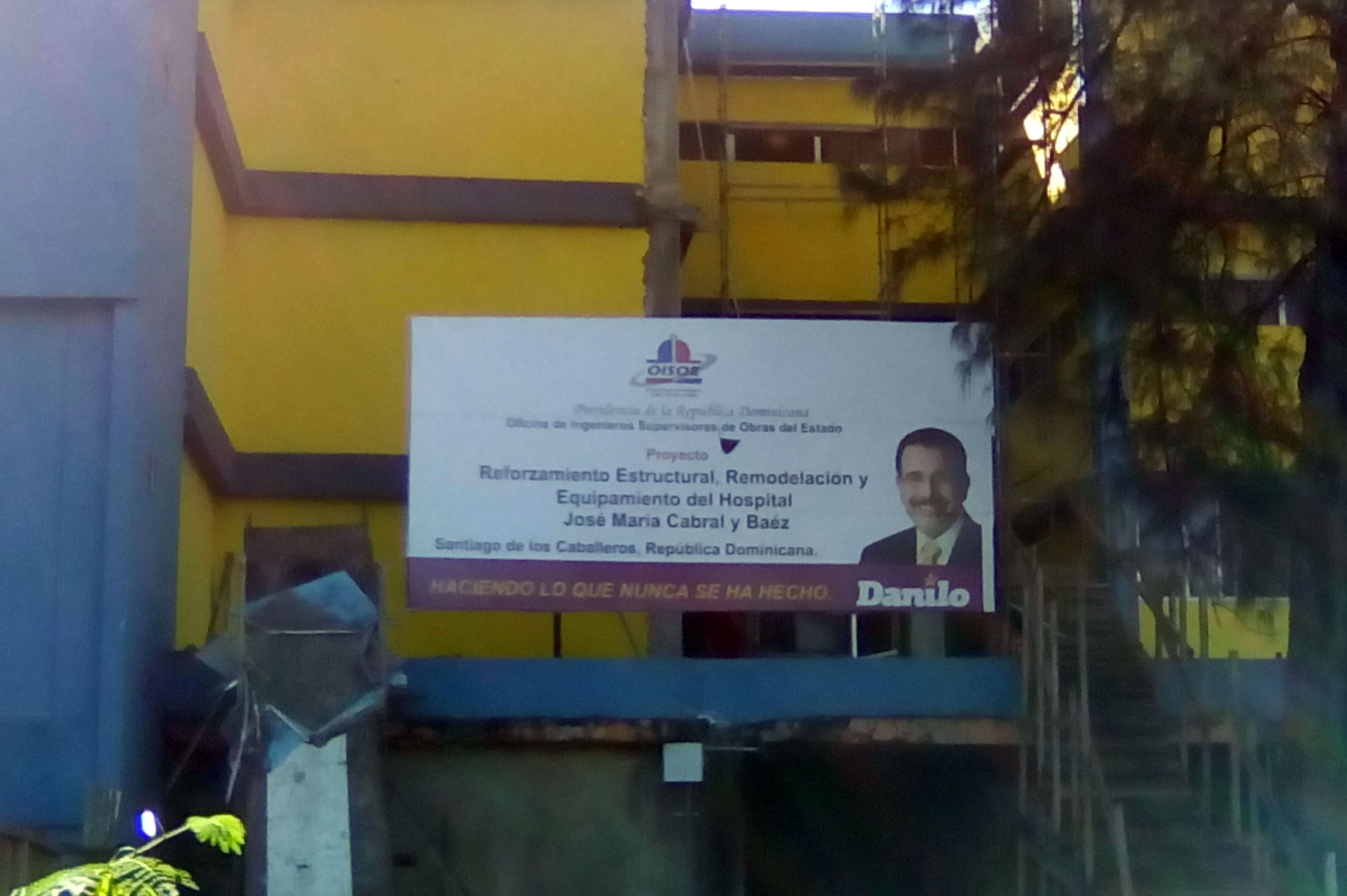 Con el transcurrir del tiempo los letreros oficiales para anunciar la obra se desgastan y son restituidos una y otra vez. Mientras tanto, ninguna de las fechas anunciadas por las autoridades para entregar las áreas del Hospital José María Cabral y Báez se ha cumplido.