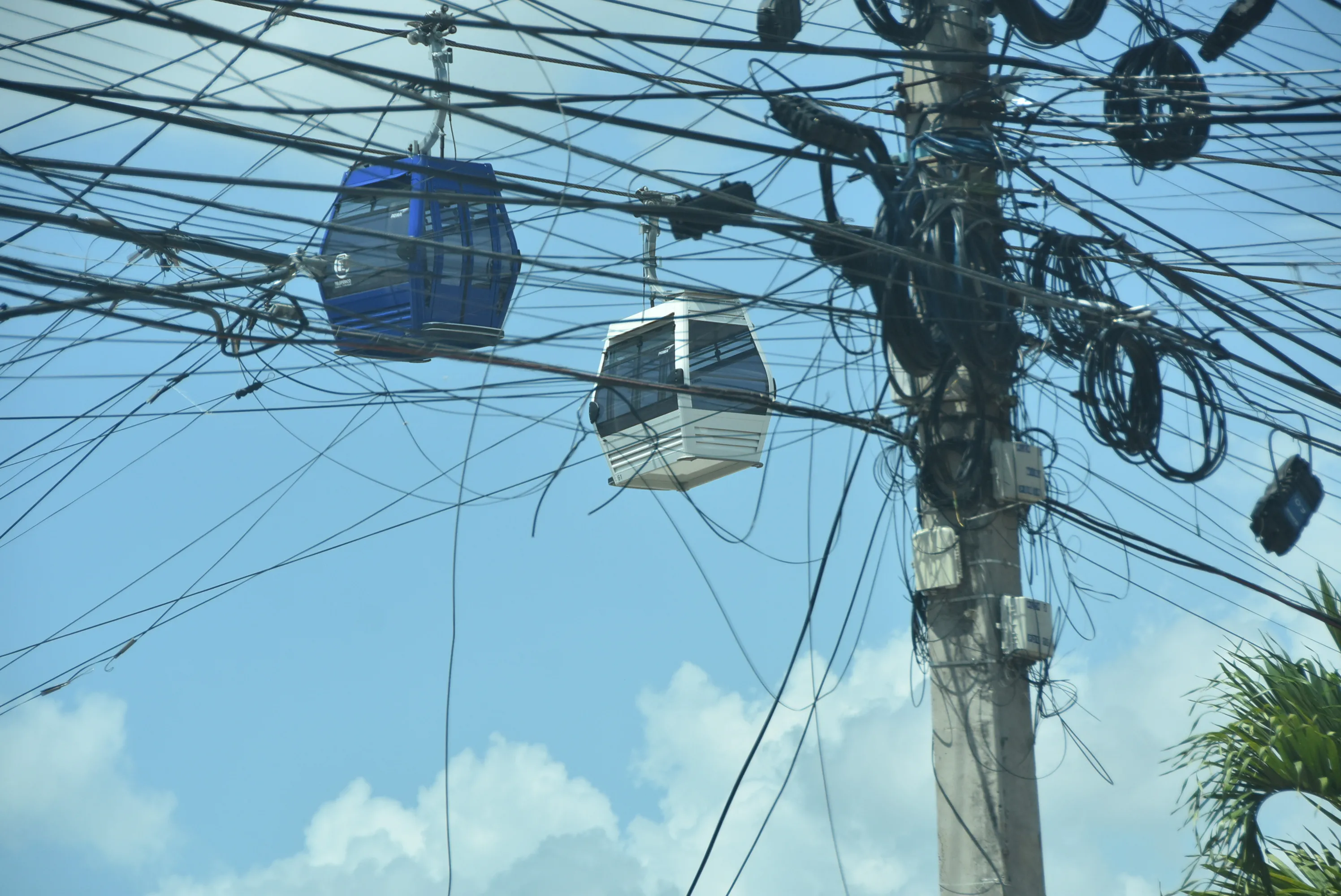 Entre cables del tendido eléctrico, edificaciones y árboles se destacan las cabinas del nuevo Teleférico en Los Alcarrizos que pueden observarse desde la entrada del municipio en la autopista Duarte.