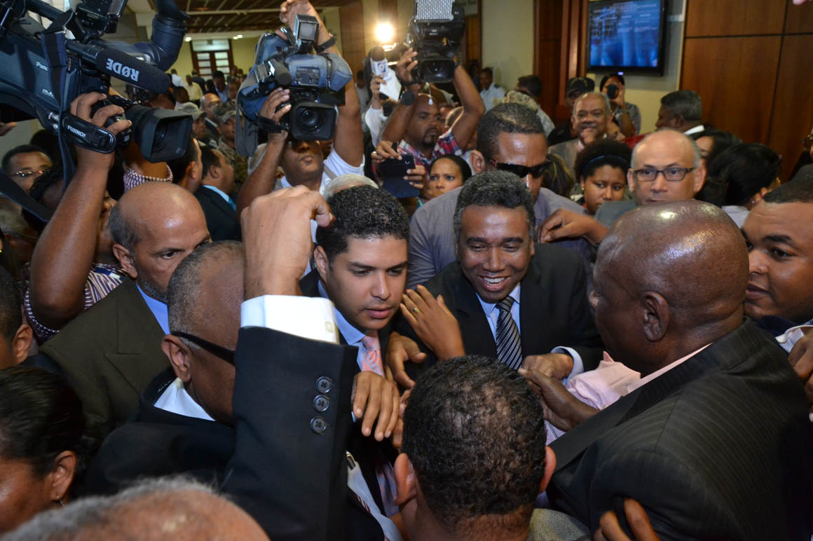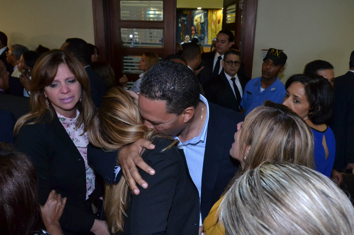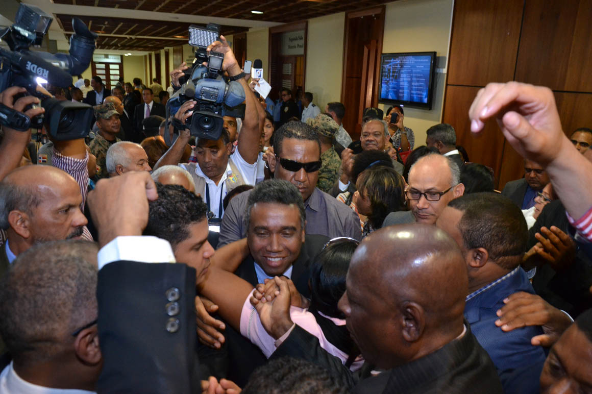 La algarabía no se hizo esperar mediante ovaciones y aplausos de los presentes, lo que motivó a Bautista a subirse a una de los banquillos de los acusados y con los dedos de ambas manos figurar el símbolo que representa a su partido, PLD.