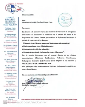 Una posición similar fue asumida por el comité de la ADP en Puerto Plata. Su presidente, Juan Carlos Almonte, señaló que el Minerd estaría desconociendo lo establecido en el Reglamento del Estatuto Docente, específicamente en el artículo 83, que otorga a los maestros el derecho a 10 días laborables por motivo de las festividades navideñas.