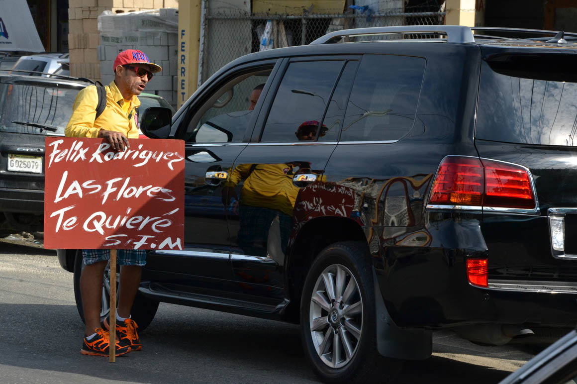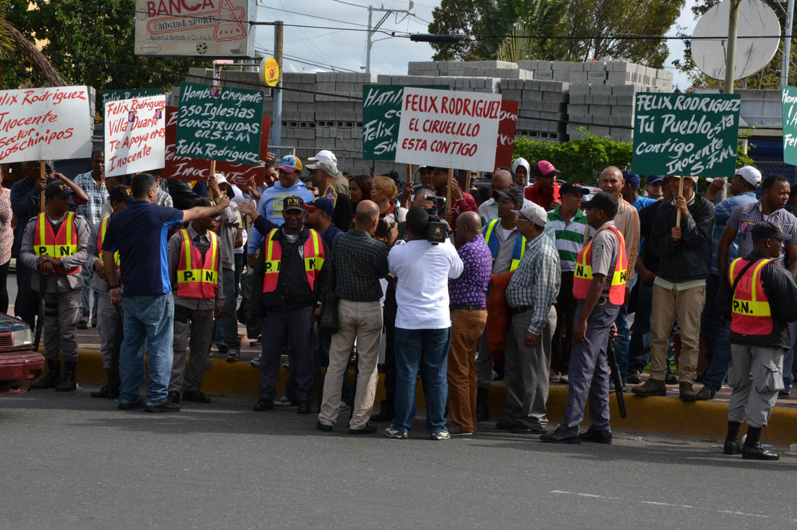 A un lado de la isleta que separa las dos vías del tránsito en la avenida Charles de Gaulle, justo frente al Palacio de Justicia de Santo Domingo, se encontraban manifestantes que defendieron de los hechos de corrupción de los cuales se le acusa al sindico del PLD, Félix Rodríguez, con alegóricas palabras de agradecimiento por su colaboración con el pueblo francomacorisano.