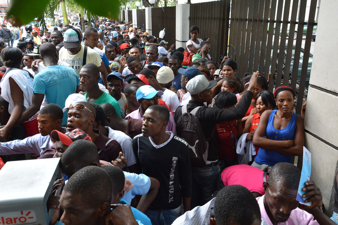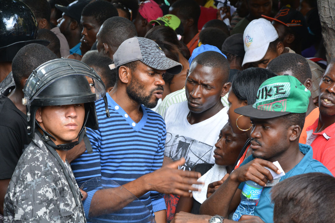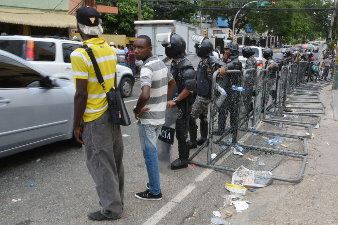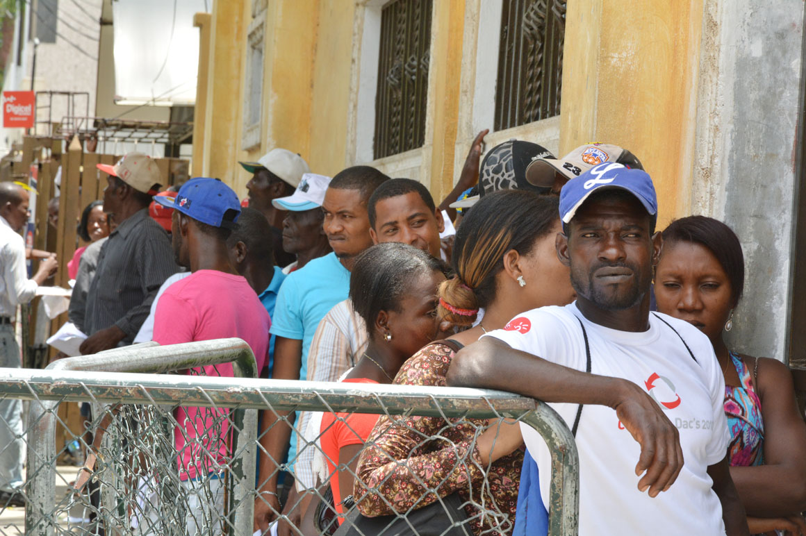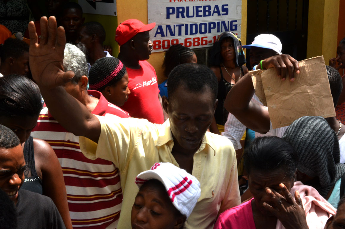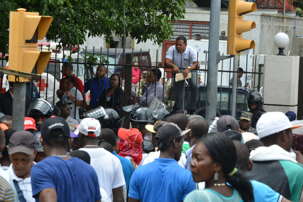 En la esquina de la avenida Francia y Leopoldo Navarro, una camioneta de la prensa sirve como refugio del calor a un señor que mira por el retrovisor la escena de la acera del frente: una hilera de brazos que se levantan, cuerpos que se agitan y voces que mezclan el español y el creole.