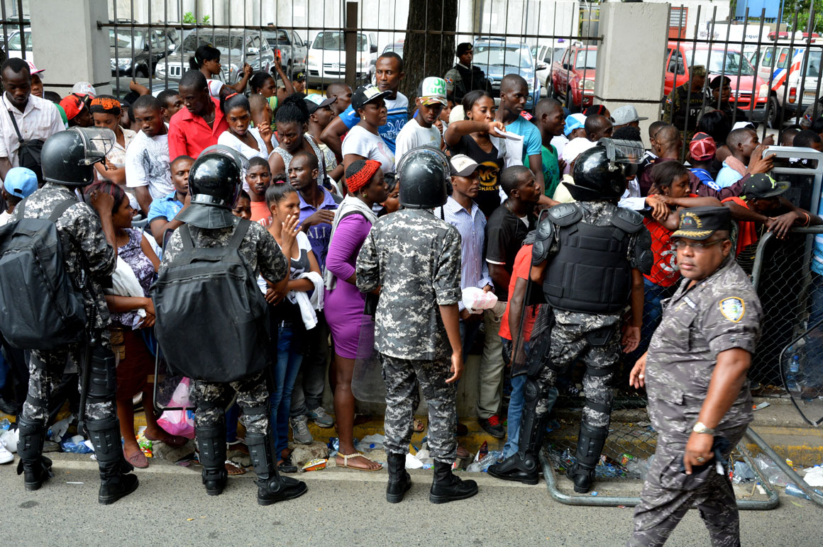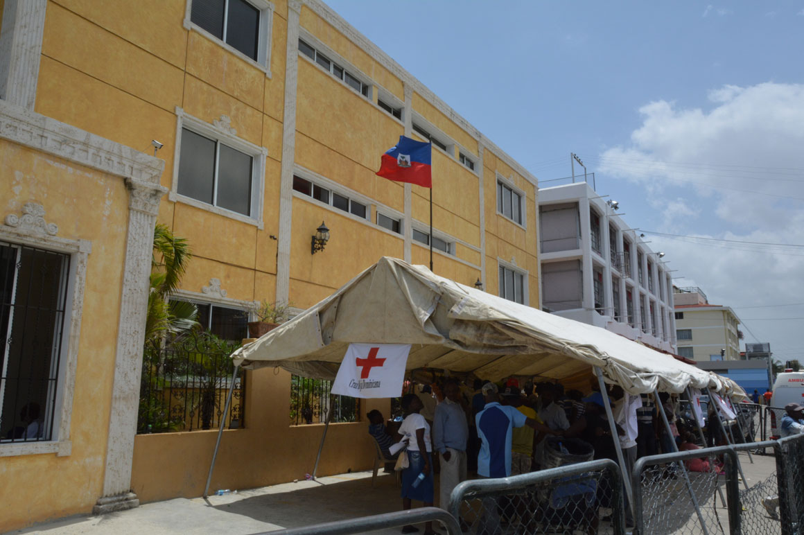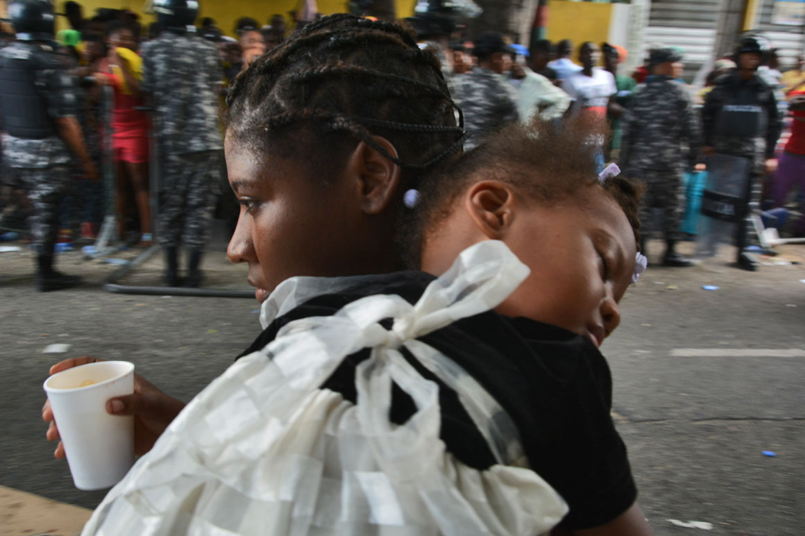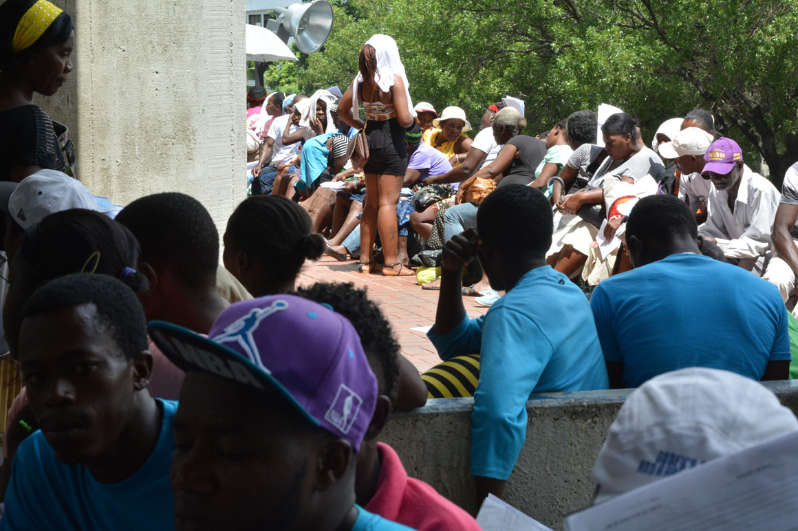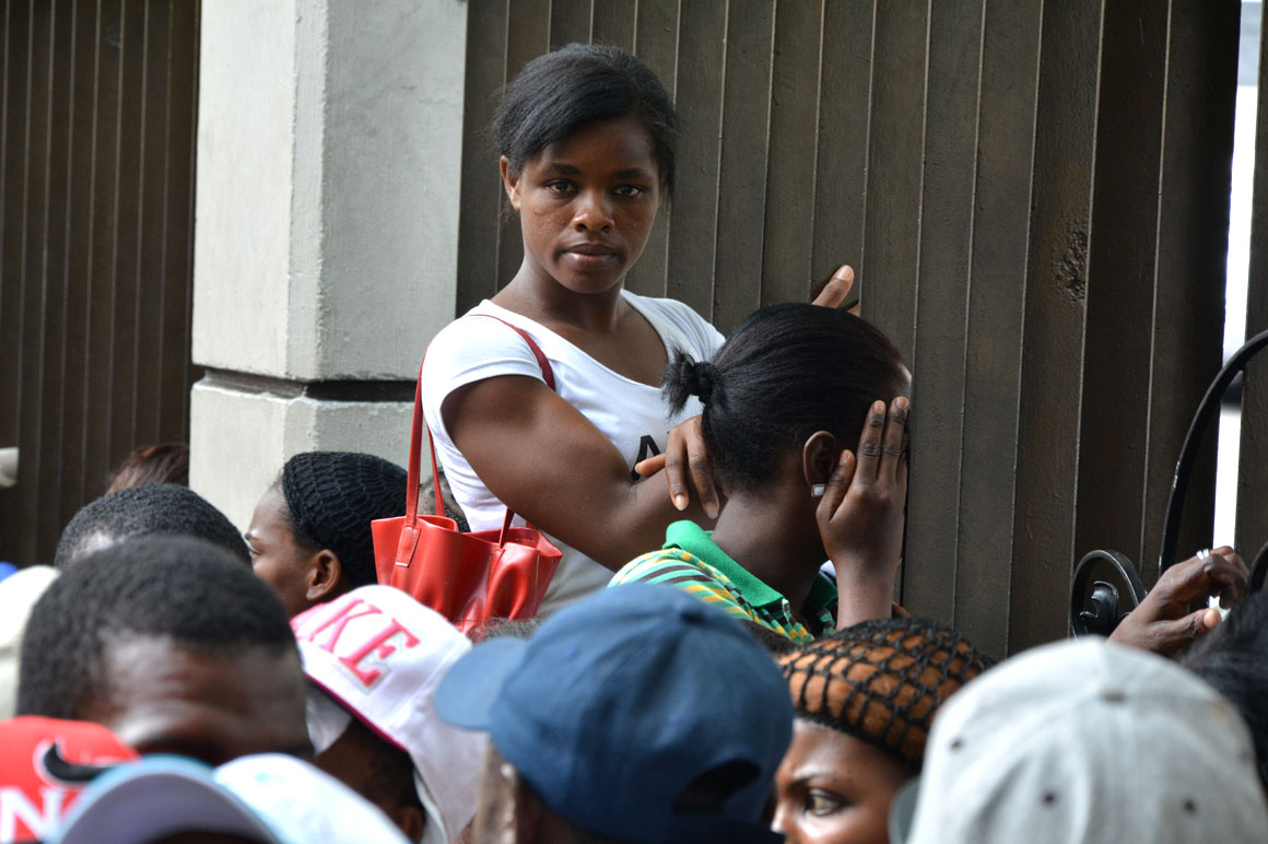 En la esquina de la avenida Francia y Leopoldo Navarro, una camioneta de la prensa sirve como refugio del calor a un señor que mira por el retrovisor la escena de la acera del frente: una hilera de brazos que se levantan, cuerpos que se agitan y voces que mezclan el español y el creole.
