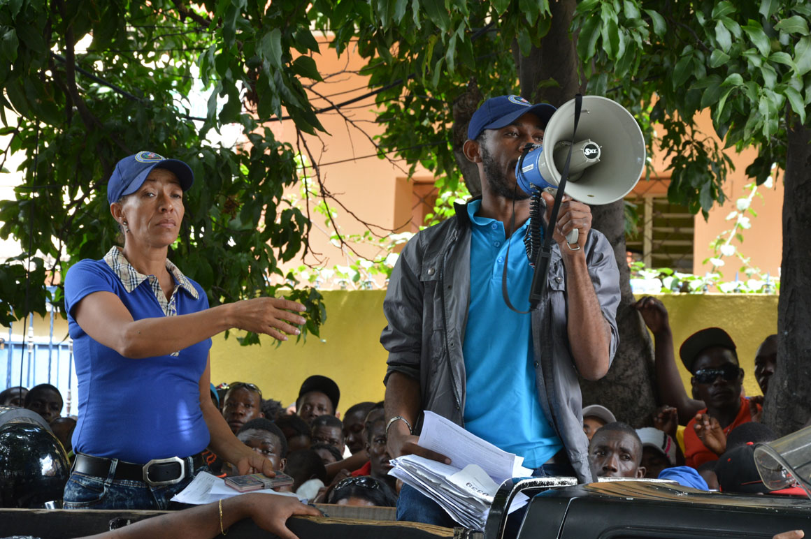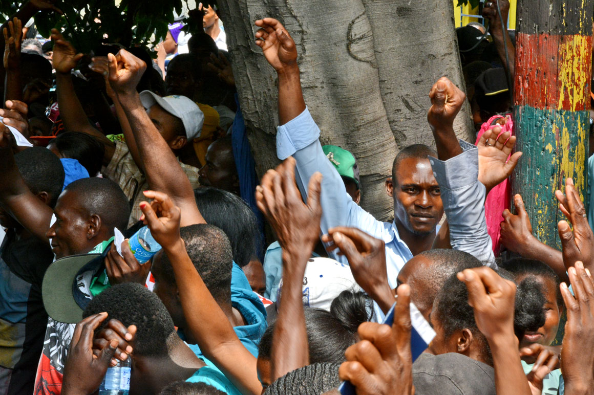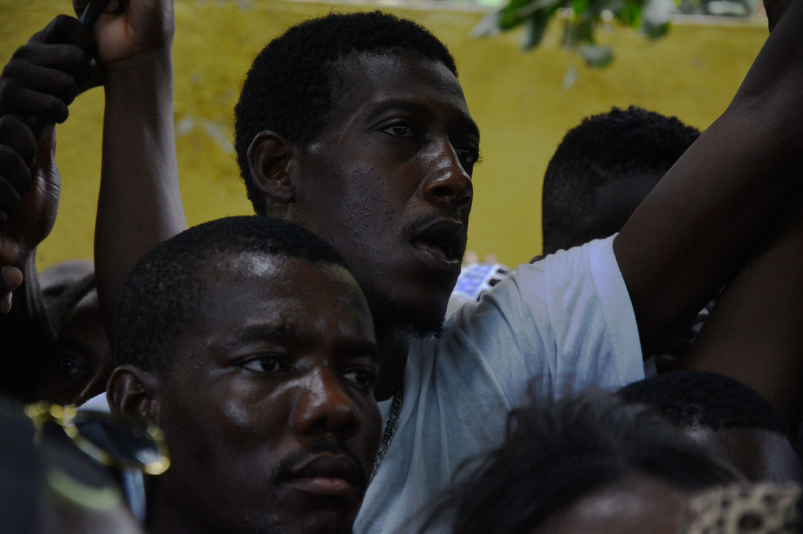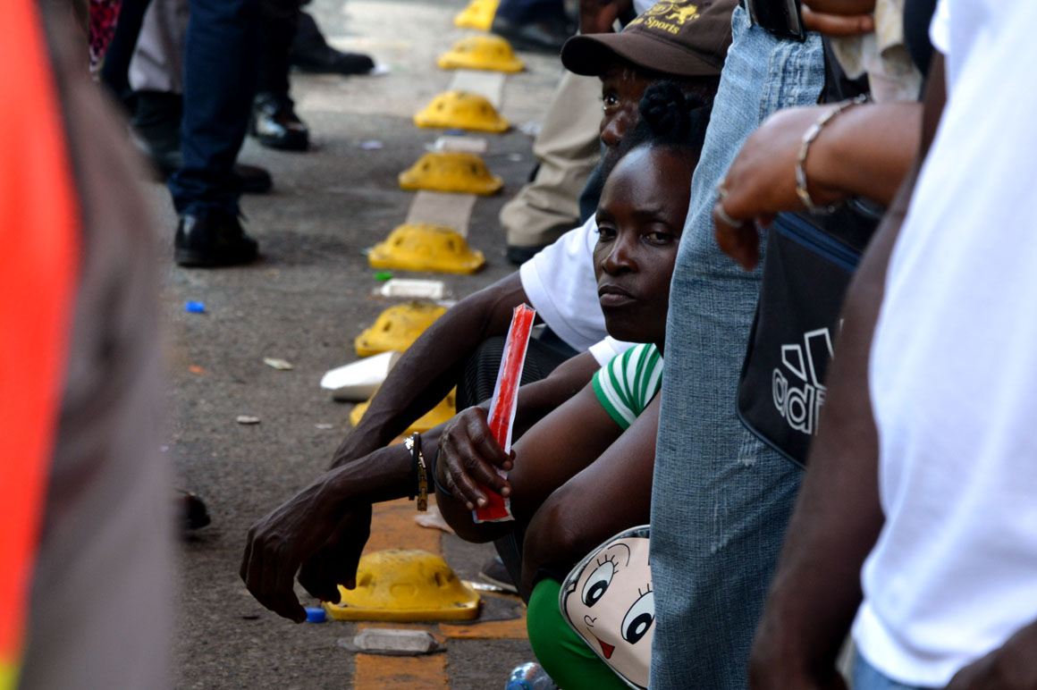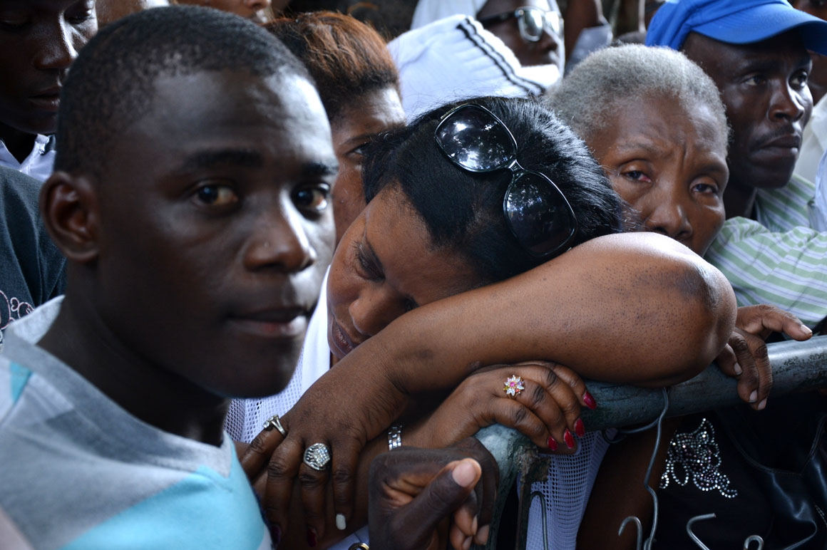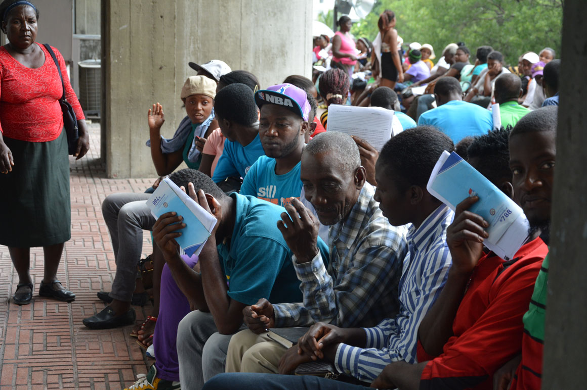 En la esquina de la avenida Francia y Leopoldo Navarro, una camioneta de la prensa sirve como refugio del calor a un señor que mira por el retrovisor la escena de la acera del frente: una hilera de brazos que se levantan, cuerpos que se agitan y voces que mezclan el español y el creole.