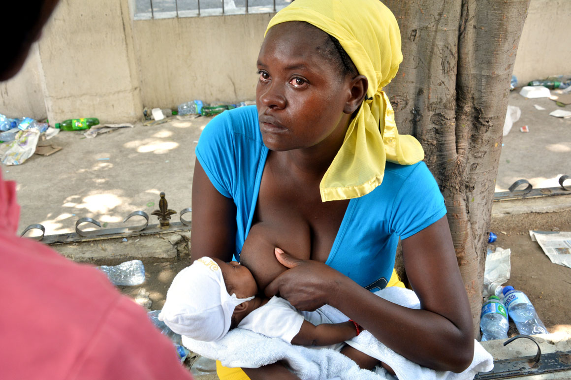 Una joven mujer recién parida pide permiso a un policía, para sentarse en el borde de una jardinera entre la basura, con un niño en brazos, cubierto con un manto blanco. Extiende la morena mano y descubre el rostro de la criatura antes de acercarlo al seno desnudo.