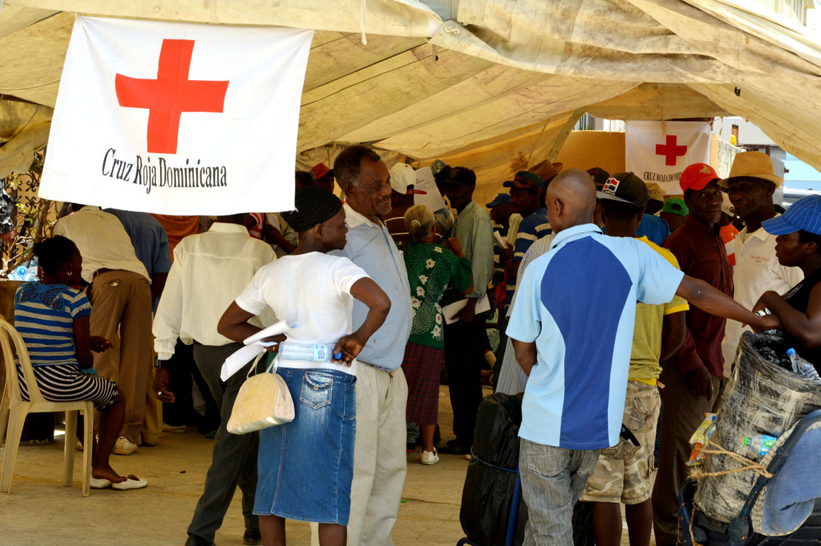 Frente a ellas, cuatro jóvenes de la Cruz Roja Dominicana arman una mesa y colocan la bandera característica de la entidad. Uno, dos, tres, cuatro recipientes de agua sobre la mesa, para refrescar la sed física de quienes lo necesiten.