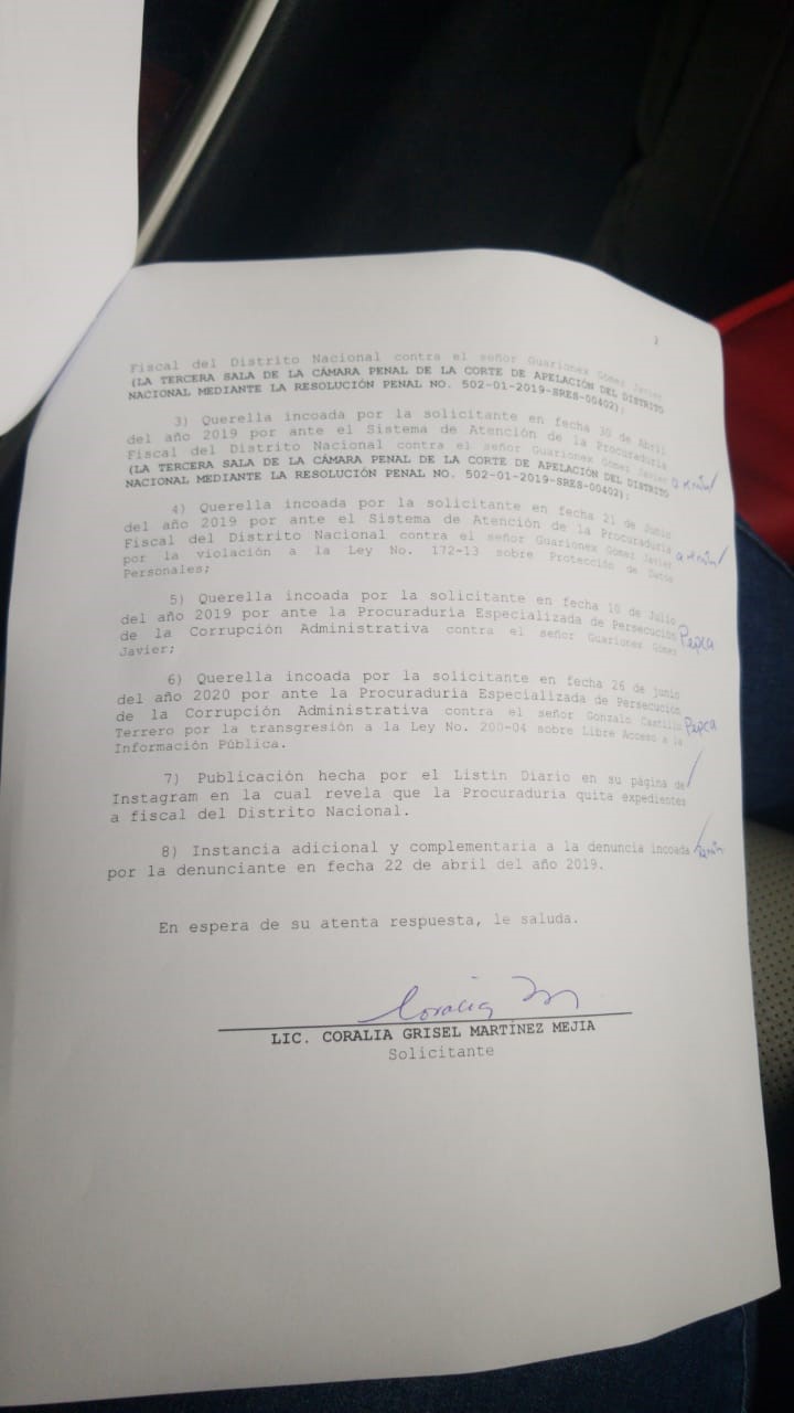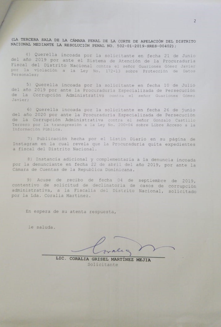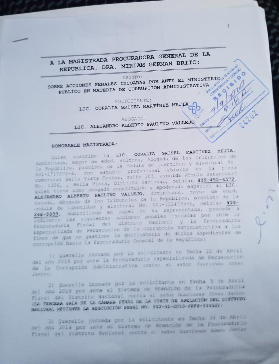 SANTO DOMINGO, República Dominicana.- La abogada Coralia Martínez Vallejo solicitó mediante comunicación formal a la Procuraduría Fiscal del Distrito Nacional que seis querellas de corrupción depositadas cotra Gonzalo Castillo, exministro de Obras Públicas, sean remitidas a la Procuraduría General de la República, para que la procuradora Miriam Germán Brito pueda darles curso.