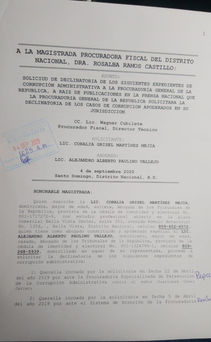 La solicitud fue hecha por intermedio de su abogado el licenciado Alejandro Alberto Paulino, de las cuales una de ellas fue interpuesta por ante la Procuraduría Especializada de Persecución de la Corrupción Administrativa.