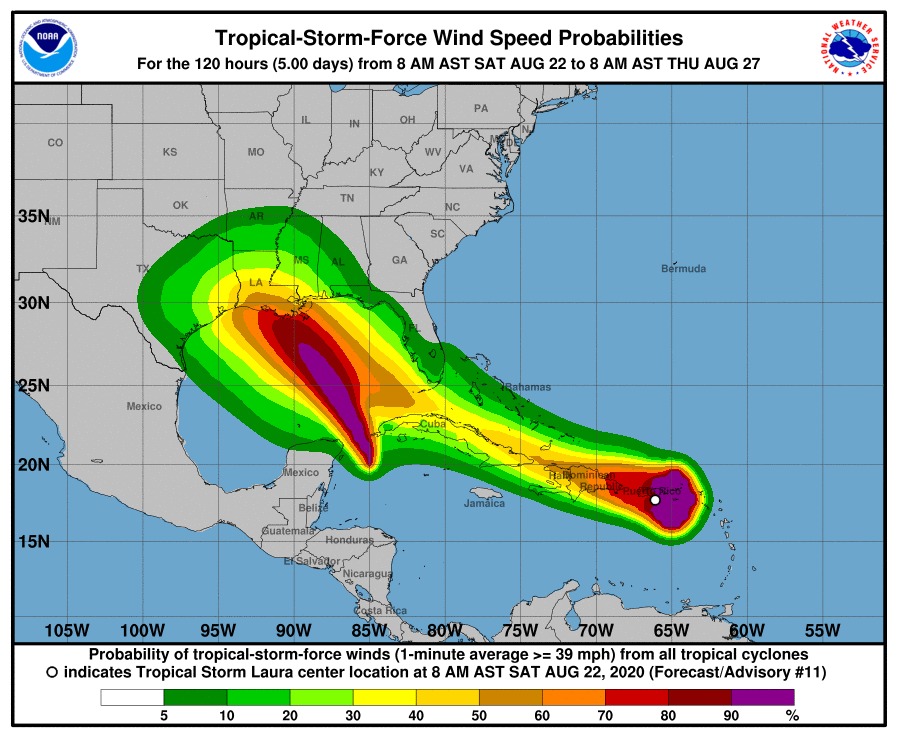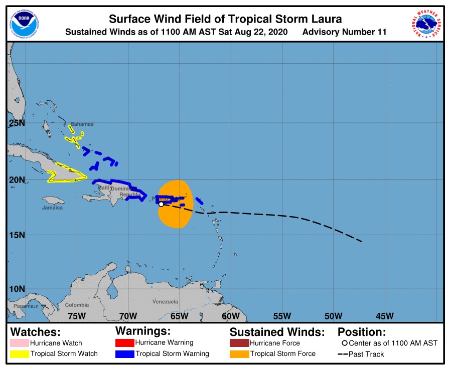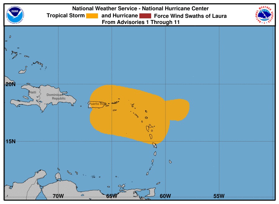 La ampliación de las alertas va desde Cabo Engaño hasta Punta Palenque y se mantiene desde Cabo Engaño hasta la Bahía de Manzanillo en Montecristi. El boletín establece que el centro de la tormenta tropical Laura se ubicó en la latitud 17.8 norte y longitud 66.5 oeste, a unos 90 km al sur/suroeste de San Juan, Puerto Rico y a unos 215 km al sureste de Cabo Engaño. Se mueve hacia el oeste a unos 33 km/h, con vientos máximos sostenidos de 65 km/h. Presión mínima central de 1006 milibares.