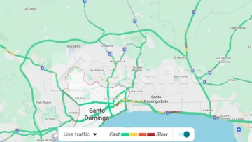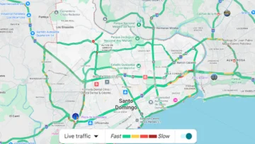 De acuerdo con el monitoreo del tránsito en tiempo real de Google Maps, se observan ligeras congestiones en tramos de la autopista Las Américas, especialmente en la entrada hacia Santo Domingo Este, así como en la avenida 27 de Febrero, avenida John F. Kennedy y la zona del Faro a Colón.