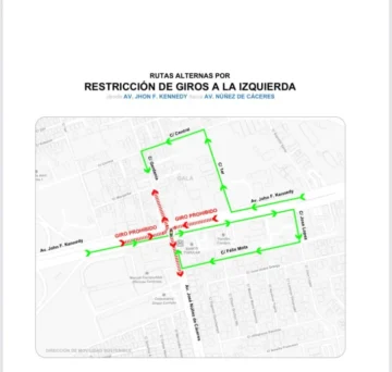Mientras que, para aquellos que se desplazan desde el oeste hacia el norte deberán continuar directo hasta la calle José López, girar a la derecha, luego nuevamente a la derecha en la calle Félix Mota y, desde allí, tomar la avenida Núñez de Cáceres en dirección norte para cruzar la John F. Kennedy.