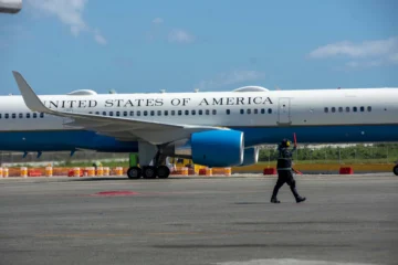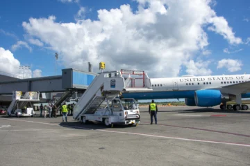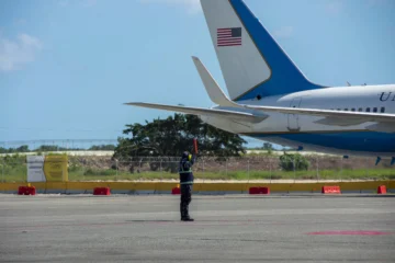 El reloj marcó la 1:20 de la tarde cuando el horizonte cambió. Un avión de fuselaje impoluto, azul en el vientre y blanco en el dorso, con la inscripción "UNITED STATES OF AMERICA" y la bandera de las barras y las estrellas en la cola, tocó suelo dominicano. Para la 1:24 PM, la aeronave ya descansaba frente al bloque de prensa, conectada al puente del aeropuerto.