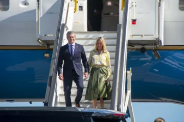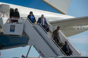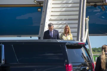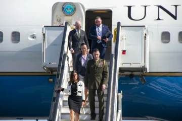 Pete Hegseth, secretario de Guerra de los Estados Unidos, emergió bajo el sol caribeño. Vestía un traje oscuro y corbata azul con estampado de banderas estadounidenses. No bajó solo; su mano sostenía firmemente la de su esposa, quien lucía una blusa florida amarilla y una falda larga verde. Antes de descender, ambos se miraron y compartieron una sonrisa cómplice, un gesto de humanidad que rompió por un segundo la rigidez del protocolo de seguridad global.