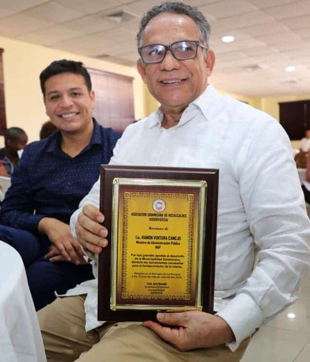 “La ASODOVISECAL reconoce al lic. Ramón Ventura Camejo, ministro del MAP, por sus grandes aportes al desarrollo de la Municipalidad Dominicana, dándole las herramientas necesarias para el fortalecimiento de las mismas. Dado en el municipio de La Romana, a los 12 días del mes de julio del año 2019”, expresa el escrito de la placa entregada al funcionario.