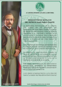 La Academia Dominicana de la Historia, presidida por Miguel Reyes Sánchez, emitió este lunes un mensaje a la sociedad dominicana con motivo de la conmemoración del 213 aniversario del natalicio de Juan Pablo Duarte, fundador de la República y Padre de la Patria.