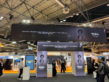 “Nuestro corazón está con las víctimas y sus familias. Descansen en paz”, se puede leer en uno de los banners colocados que estará durante toda la feria.