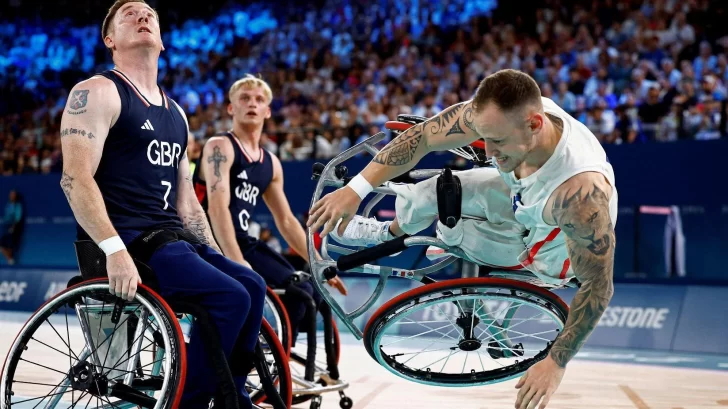 Alexis Ramonet de Francia cae al piso en medio del juego de basquetbol paralímpico
