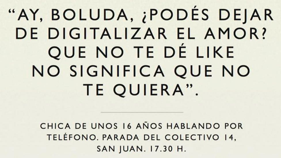 "Era un día feriado y estábamos con Tatiana Goldman, que es mi amiga y socia en este proyecto, en un barcito de la calle Gurruchaga, y en la mesa de al lado había una parejita que hablaba de celos, sexo e infidelidades, y ahí nació la idea de hacer un libro que registrara la forma de hablar de la sociedad".