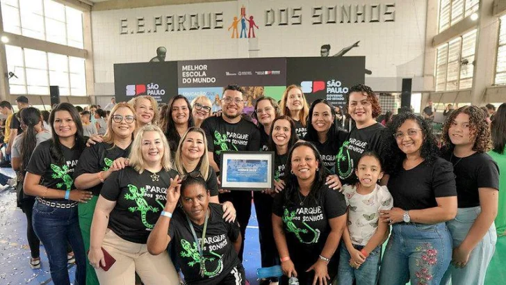 Equipo de profesores de la Escuela Estatal Parque dos Sonhos con certificado del premio internacional.